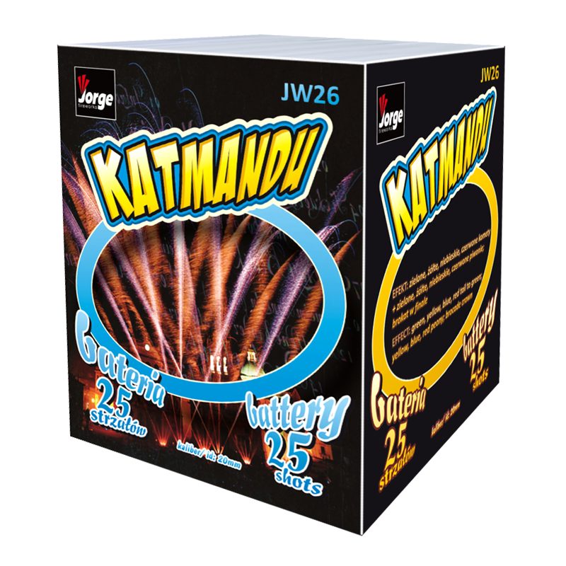 Mit 25 kraftvollen Schuss im Kaliber 20 mm und einer Brenndauer von etwa 30 Sekunden bietet Katmandu ein intensives, farbenfrohes Erlebnis – perfekt abgestimmt für ein klares, harmonisches Gesamtbild am Nachthimmel.