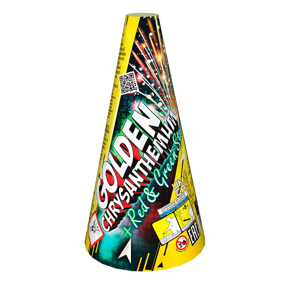 Dieser hochwertige Vulkan entfacht eine majestätische goldene Chrysantheme, die sich kraftvoll nach oben ausbreitet und den Himmel in ein funkelndes Goldmeer taucht. Zwischen den goldenen Funken steigen leuchtend rote und grüne Sterne auf, die für einen farbenfrohen, kontrastreichen Effekt sorgen.